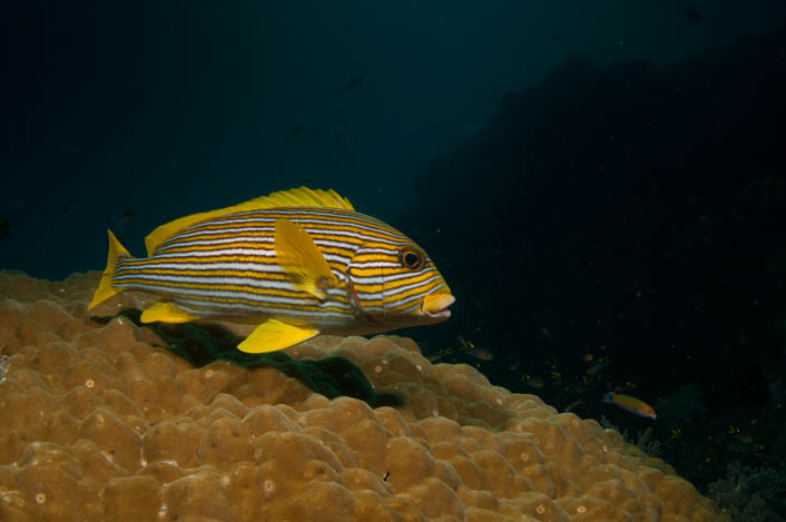 Ein weiterer Spassfaktor im Riff ist der kleine gelbe Kofferfisch , ca. 10 cm. Er ist der kantigste Fisch aus der Gruppe der Kugelfische. Leider bleibt er nicht so, es ist lediglich eine junge Form des Gelbbraunen Kofferfisch, der im Erwachsenenalter allerdings auch sehr schön gefärbt ist. Aber der Kleine ist natürlich aufregender! Er hat einen ähnliche Schwimmstil wie Dorie und man könnte sagen er hüpft im Riff umher. Es ist lustig zuzusehen und zu versuchen in zu verfolgen. Manchmal hat man den Eindruck er dreht sich um und wartet um zu sehen, dass der Taucher auch sicher nachgeschwommen kommt – und schon ist er wieder um die nächste Korallenecke verschwunden.