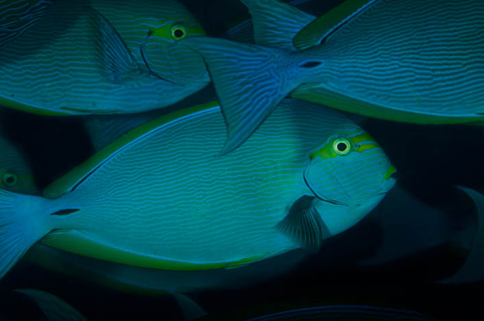 Sie werden an die 30 cm gross und sind ziemlich flach gedrückte Fische. Gertenschlank sozusagen. Der Name Doktorfisch ist von den hornartigen Klingen – Skalpellen – abgeleitet, die diese Fische vor der Schwanzwurzel tragen. Diese Skalpelle sind wirklich rasiermesserscharf. Sie werden zur Verteidigung eingesetzt, entweder gegen Fressfeinde oder bei Auseinandersetzungen untereinander. Für Taucher in der Regel ganz ungefährlich, allerdings haben die Doktorfische die aufsteigenden Blasen aus den Automaten sehr, sehr gerne und kommen deswegen manchmal nah an den Kopf der Taucher. Da muss man schon ein wenig aufpassen und ausser Reichweite der Skalpelle bleiben.