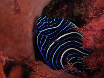 Wie auch schon die anderen Fische des Monats Februar macht schliesslich auch der Kaiserimperator eine Wandlung in Form und Farbe vom jungen zum erwachsenen Fisch durch. In beiden Stadien ein wunderschöner Fisch. Der kleine blau-weisse Teller ist meist so 10-15 cm gross und der ausgewachsene Fisch dann 40-50 cm gross. Leider haben wir es nie geschafft von einem ausgewachsenen Exemplar ein gutes Foto zu schiessen. Erstens sieht man sie selten und zweitens scheinen sie absult kein Interesse daran zu haben fotografiert zu werden. Wir haben tonnenweise Fotos von hinten oder von oben, aber wirklich wirklich kein gutes. Da sind die jungen noch kooperativer.